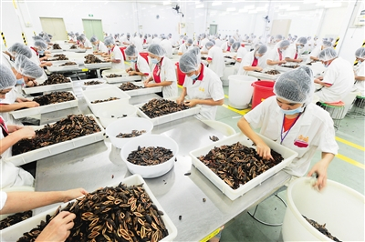 海南口味王东澳镇基地,来自万宁的工人正在加工、包装槟榔产品。来源:海南日报