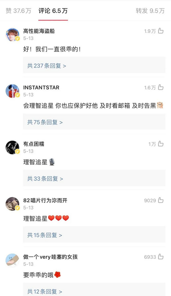 在某流量明星工作室号召理智追星的微博下方,粉丝也开始了控评