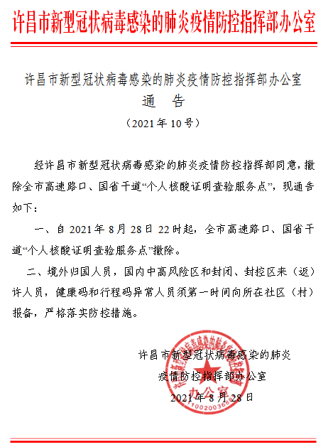 经许昌市新型冠状病毒感染的肺炎疫情防控指挥部同意,自2021年8月28日22时起,全市高速路口、国省干道“个人核酸证明查验服务点”撤除。境外归国人员,国内中高风险区和封闭、封控区来(返)许人员,健康码和行程码异常人员须第一时间向所在社区(村)报备,严格落实防控措施。