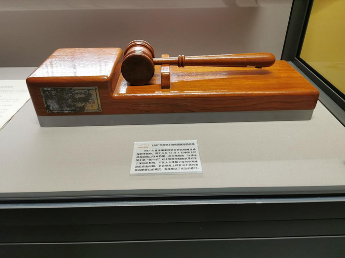 1987年深圳土地有偿使用的拍卖槌。 新华社记者 孙飞 摄