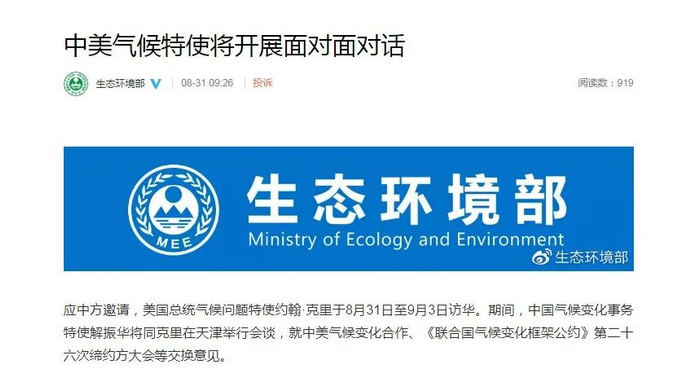 应中方邀请,美国总统气候问题特使约翰·克里于8月31日至9月3日访华。期间,中国气候变化事务特使解振华将同克里在天津举行会谈,就中美气候变化合作、《联合国气候变化框架公约》第二十六次缔约方大会等交换意见。