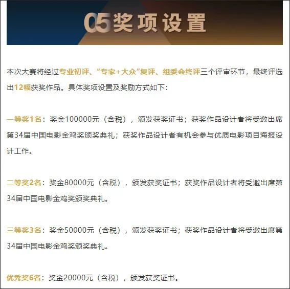 据中国电影家协会官方微信公众号消息,由中国电影家协会及中共厦门市委宣传部联合主办的第34届中国电影金鸡奖海报设计大赛,首次面向全社会征集主视觉海报,要求聚焦庆祝中国共产党成立100周年和中国电影金鸡奖创办40周年的核心主题,征集时间为2021年5月23日至7月15日。