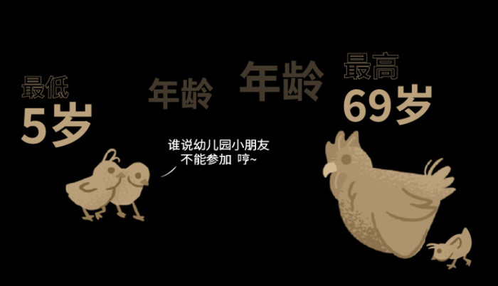 投稿作者年龄横跨近三辈人,最年长的选手69岁,最年轻的仅5岁,可谓全民参与,老中青齐上阵,其中50年代的参赛者有7位、60年代的参赛者有15位、70-80年代的参赛者有338位,而90年代的参赛者则占比最高,人数达到434位,千禧年代的参赛者也达到279位。