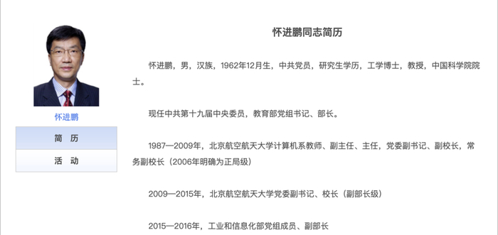公开资料显示,怀进鹏曾任北京航空航天大学党委副书记、校长(副部长级),工业和信息化部党组成员、副部长,天津市委副书记,中国科学技术协会党组书记等。今年8月20日成为教育部部长。