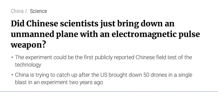 该报道引用香港《南华早报》的描述称,中国公开发表的一篇论文显示,中国工程师使用一种新型电磁脉冲(EMP)武器击落一架大型无人机,这可能是中国首次公开的对EMP武器的实际测试。