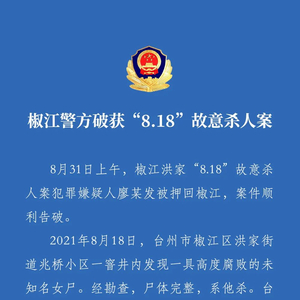 据“椒江公安”微信公号31日消息,浙江省台州市公安局椒江分局椒江警方破获“8.18”故意杀人案,通报全文如下: