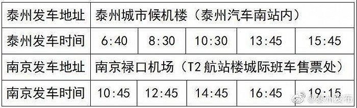 一、自2021年9月1日起,恢复泰州汽车南站至禄口机场班线,具体时刻表如图。