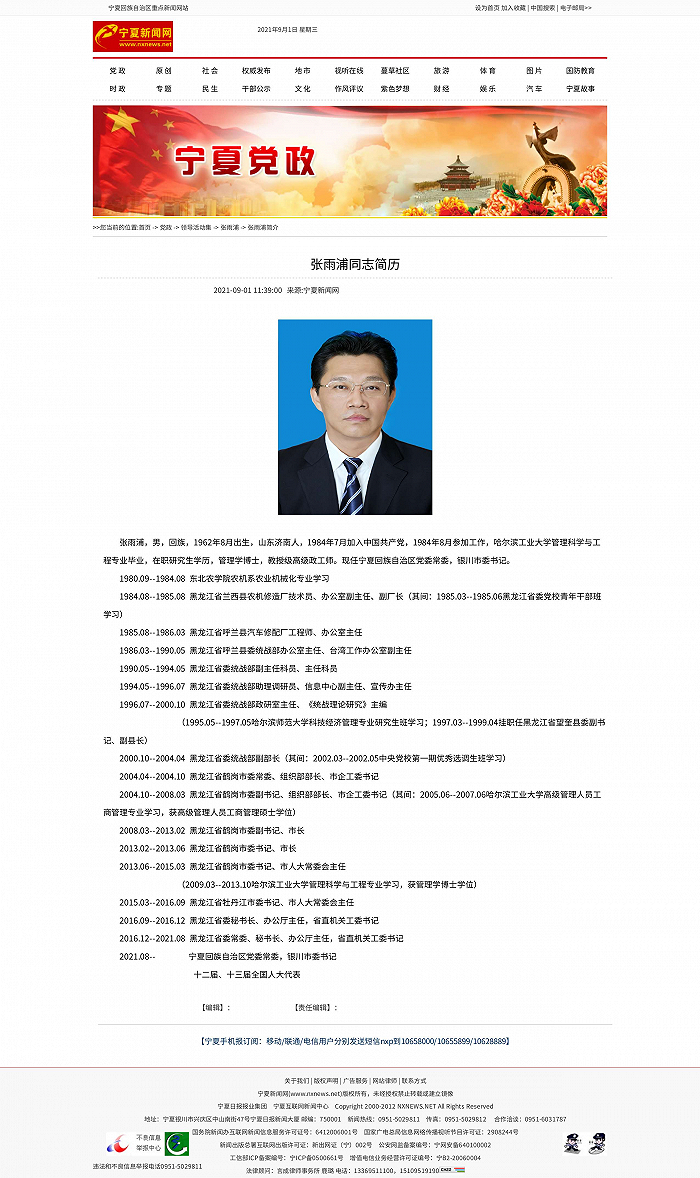 据宁夏新闻网9月1日消息,宁夏党政领导简介栏目显示,宁夏回族自治区党委常委张雨浦已任银川市委书记。据宁夏日报8月31日消息,近日,经中共中央批准,张雨浦同志任宁夏回族自治区党委委员、常委。