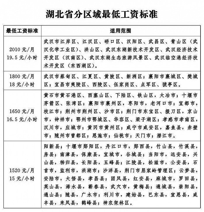 据“湖北发布”消息,根据《省人民政府办公厅关于调整全省最低工资标准的通知》(鄂政办发〔2021〕33号)精神,2021年9月1日起,湖北省执行新的最低工资标准,全省全日制就业劳动者月最低工资标准按区域划分为四档,依次为2010元、1800元、1650元、1520元,非全日制就业劳动者的小时最低工资标准依次为19.5元、18元、16.5元、15元。