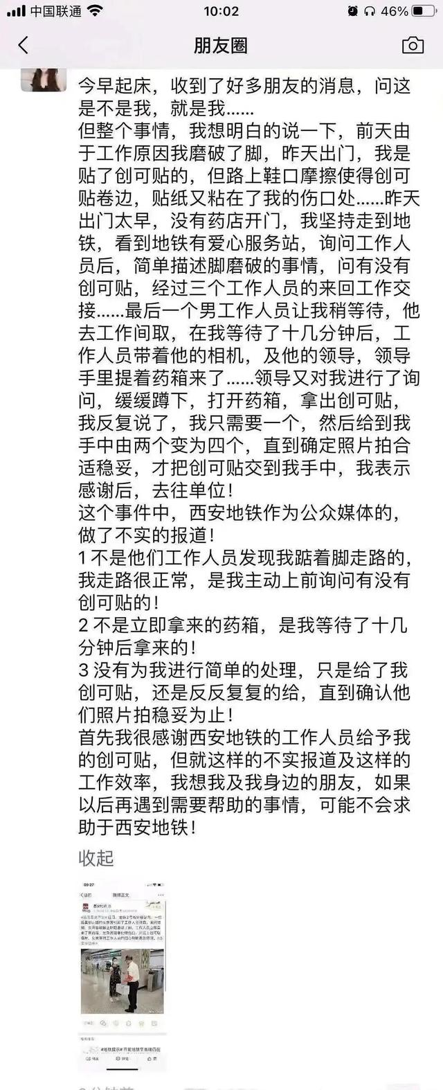 对此,当事人发文称:“不是他们工作人员发现我踮着脚走路的,我走路很正常,是我主动上前询问有没有创可贴的!”“不是立即拿来的药箱,是我等待了十几分钟后拿来的!”“没有为我进行简单的处理,只是给了我创可贴,还是反反复复的给,直到确认他们照片拍稳妥为止!”