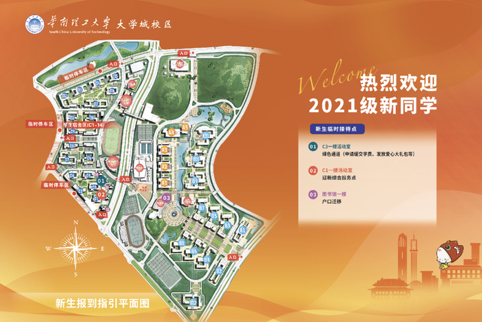大学城校区生活区设置5个返校入口,教学区设置2个返校入口。(为保证校园秩序,新生接送车辆不进入校园。家长请把车辆停放在图中所示的临时停车区,根据宿舍的方位就近从各入口步行进入校园。)