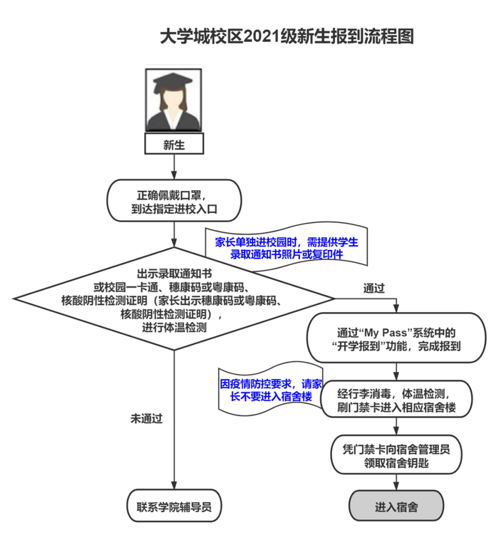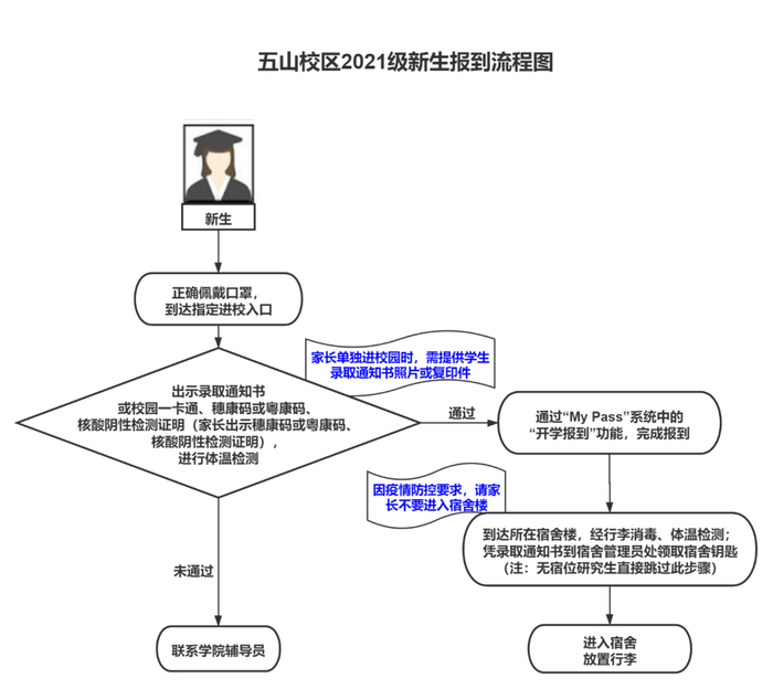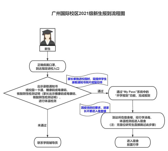 2.提前准备好穗康码或粤康码、录取通知书(校园一卡通)、48小时内核酸检测阴性证明,在门岗按指引排队、测温后入校;在进校过程中如有问题,请及时联系自己所在学院辅导员。若家长单独进入校园须提供查验学生录取通知书照片或复印件。