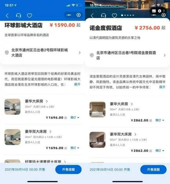 除此之外,北京环球度假区内的两家度假酒店——环球影城大酒店及诺金度假酒店也于9月14日零时开售。