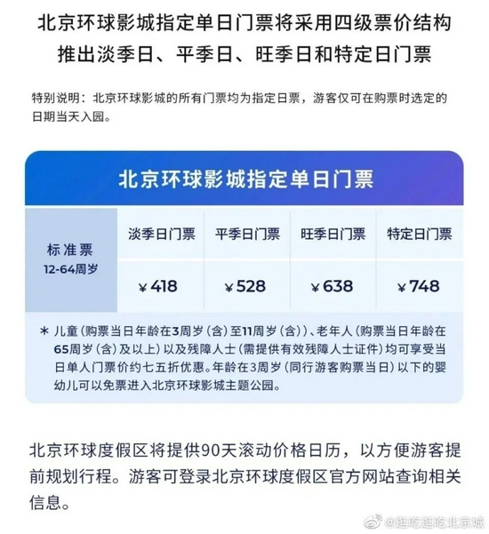 北京环球影城指定单日门票将采用四级票价结构,推出淡季日、平季日、旺季日和特定日门票。