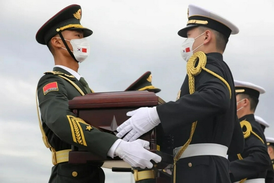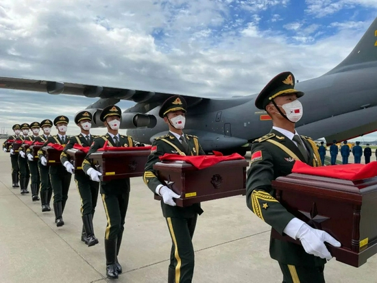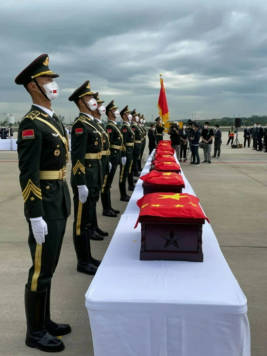 礼兵护卫着109位烈士遗骸