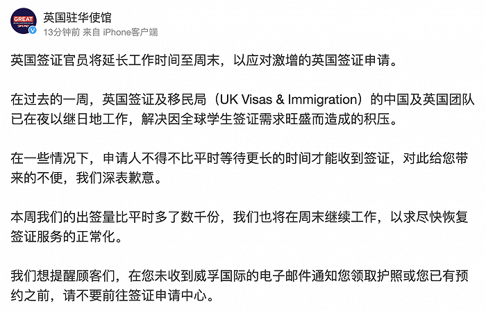 原标题:英国驻华使馆:全球学生签证需求旺盛造成积压,将延长工作时间至周末