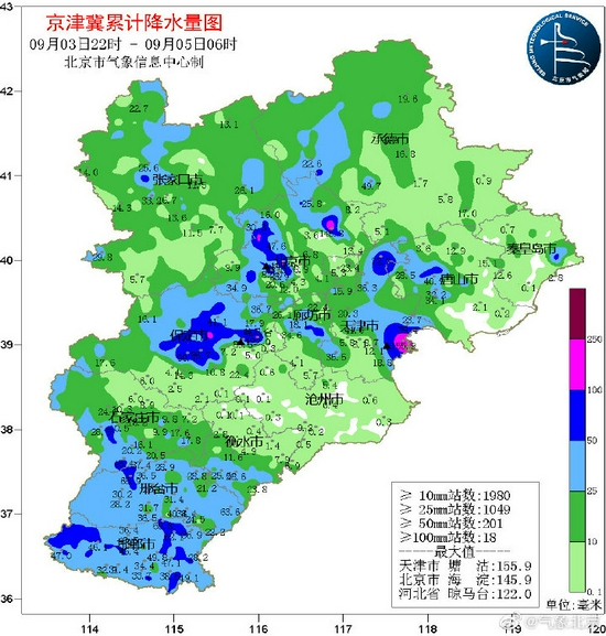 市气象台发布03日22时至05日06时降水量(毫米):全市平均24.2,城区平均27.3,西北33.5,西南28.3,东北18.0,东南12.9,城区及全市最大均为海淀观测站145.9。