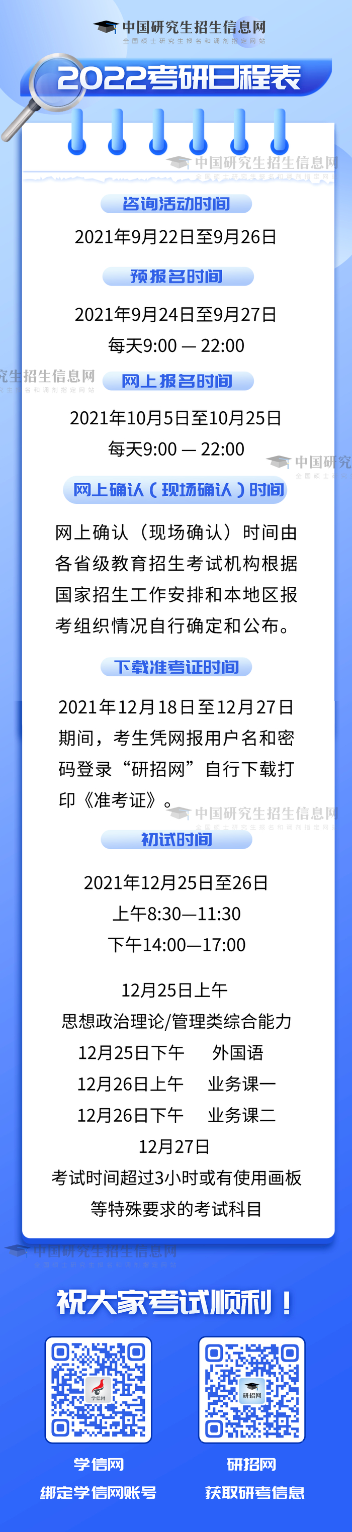 教育部于近日印发《2022年全国硕士研究生招生工作管理规定》(以下简称《规定》),部署各地各招生单位统筹做好疫情防控常态化条件下的研究生考试招生工作。2022年全国硕士研究生招生考试初试定于2021年12月25日至26日,考试时间超过3小时或有使用画板等特殊要求的少数考试科目安排在12月27日。