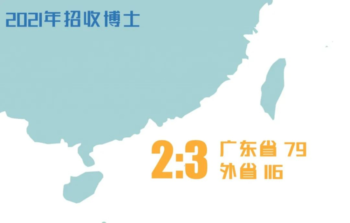 2021级博士研究生中,广东省内与省外的录取数之比为2:3,广东省内录取79名,省外共录取116名。