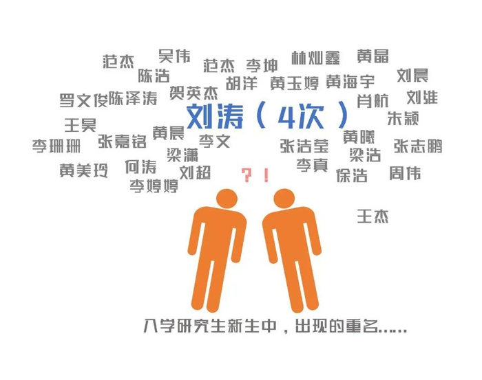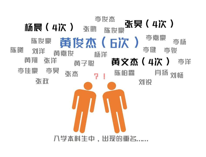 2021级入学新生中重名次数最多的姓名为“黄俊杰”同学,共有6位,除此之外,刘涛、杨晨、黄文杰、张昊也具有相当高的重名人次,不知道各位“杰哥”和“张同学”们有没有缘分在校园里遇到彼此