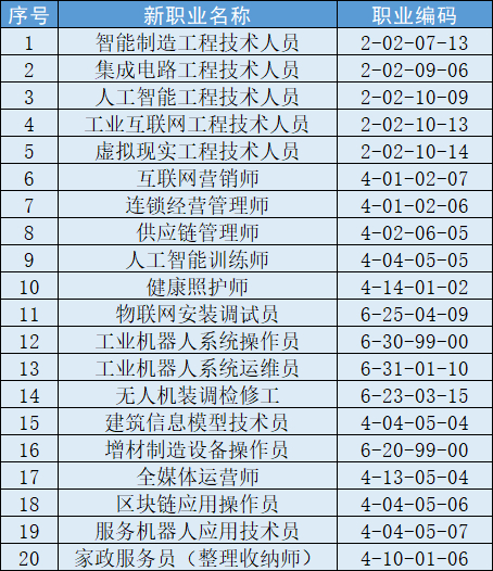 智能制造工程技术人员、集成电路工程技术人员、人工智能工程技术人员、工业互联网工程技术人员、虚拟现实工程技术人员、互联网营销师、连锁经营管理师、供应链管理师、人工智能训练师、健康照护师、物联网安装调试员、工业机器人系统操作员、工业机器人系统运维员、无人机装调检修工、建筑信息模型技术员、增材制造设备操作员、全媒体运营师、区块链应用操作员、服务机器人应用技术员、家政服务员(整理收纳师)。