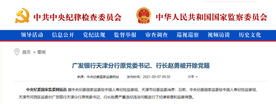 中央纪委国家监委驻中国人寿纪检监察组、天津市纪委监委:日前,中央纪委国家监委驻中国人寿纪检监察组、天津市河西区监委对广发银行天津分行原党委书记、行长赵勇严重违纪违法问题进行了纪律审查和监察调查。