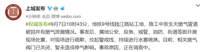 据@上城发布 微博消息,9月7日10时43分,杭州地铁9号线钱江路站工地,施工中发生天燃气管道破损并有燃气泄漏情况。事发后,属地公安、应急、城管、消防、街道等即开展现场处置,对现场进行疏散,拉起警戒线,持续进行水雾喷淋。目前,相关燃气阀门已关闭,暂未造成停气影响。事故原因,正在调查中。