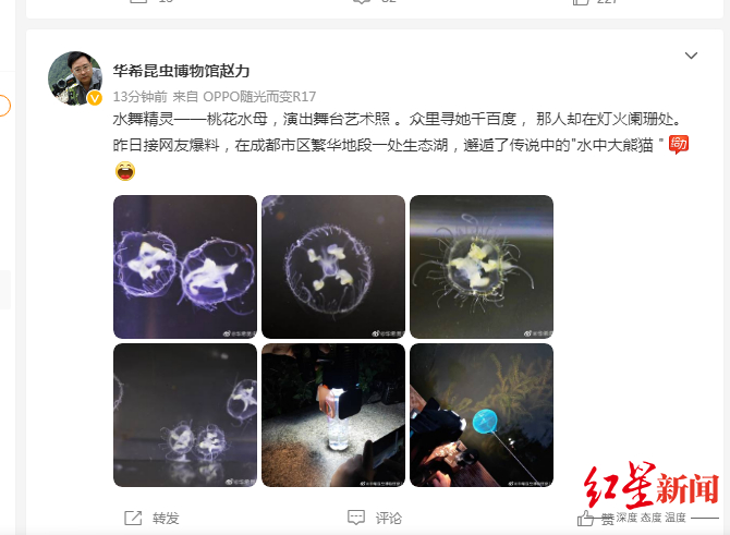 9月6日下午6点,成都华希昆虫博物馆馆长赵力收到了大观堰生态公园附近居民发来的“发现桃花水母”的消息,赶到了大观堰生态公园。