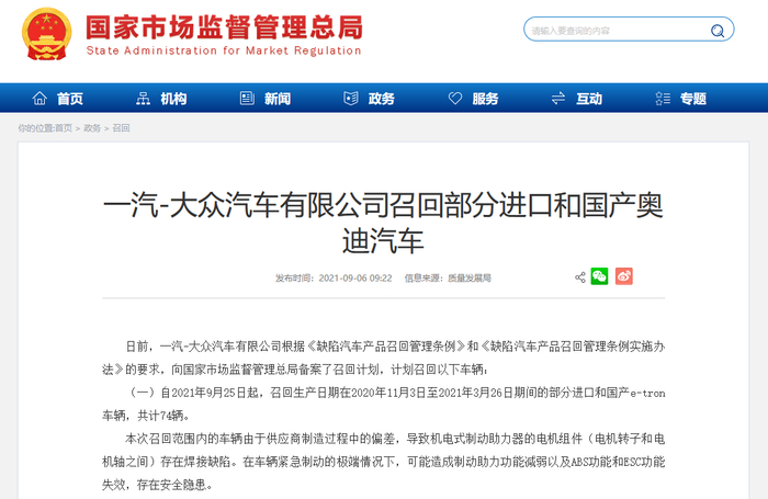 (一)自2021年9月25日起,召回生产日期在2020年11月3日至2021年3月26日期间的部分进口和国产e-tron车辆,共计74辆。