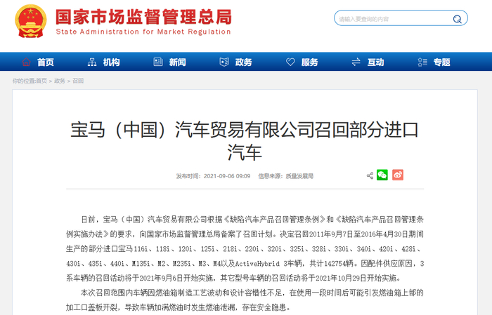 日前,宝马(中国)汽车贸易有限公司根据《缺陷汽车产品召回管理条例》和《缺陷汽车产品召回管理条例实施办法》的要求,向国家市场监督管理总局备案了召回计划。决定召回2011年9月7日至2016年4月30日期间生产的部分进口宝马116i、118i、120i、125i、218i、220i、320i、325i、328i、330i、340i、420i、428i、430i、435i、440i、M135i、M2、M235i、M3、M4以及ActiveHybrid 3车辆,共计142754辆。因配件供应原因,3系车辆的召回活动将于2021年9月6日开始实施,其它型号车辆的召回活动将于2021年10月29日开始实施。