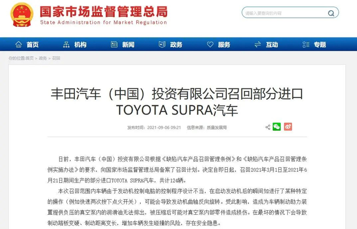 日前,丰田汽车(中国)投资有限公司根据《缺陷汽车产品召回管理条例》和《缺陷汽车产品召回管理条例实施办法》的要求,向国家市场监督管理总局备案了召回计划。决定自即日起,召回2021年3月1日至2021年6月21日期间生产的部分进口TOYOTA SUPRA汽车,共计124辆。