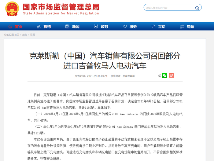日前,克莱斯勒(中国)汽车销售有限公司根据《缺陷汽车产品召回管理条例》和《缺陷汽车产品召回管理条例实施办法》的要求,向国家市场监督管理总局备案了召回计划。决定自2021年9月6日起,召回部分2021年款2.0T 4xe吉普牧马人电动汽车,共计1160辆。具体如下: