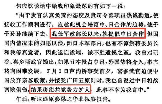 而事实是,何应钦担任军政务部长时是著名的亲日派。《岗村宁次回忆录》对何应钦的描述是:何应钦:“我任军政部长以来,就提倡中日合作”“中日相战,两败俱伤,结果将使共党势力扩大”。