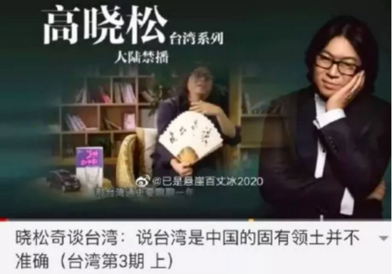 在海外视频平台,高晓松甚至还曾发表过“台湾是中国的固有领土并不准确”的观点,而该视频在大陆还是禁播状态。