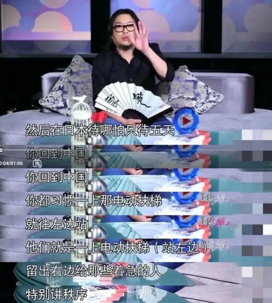 他还要吹捧日本人素质高,说自己从日本回国以后,人直接变得“特别讲秩序” ,影射中国人不讲秩序。