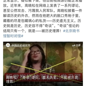 至于缘由,@中国历史研究院 日前直接点名高晓松,怒斥其在网络上发表了一系列谬论,甚至公然攻击、污蔑我人民军队,以“解读历史”的名头宣扬着包藏祸心的历史虚无主义,“历史就是历史,历史容不得‘奇谈’。‘奇谈’怪论的结局只有一个,就是——被历史埋葬!”