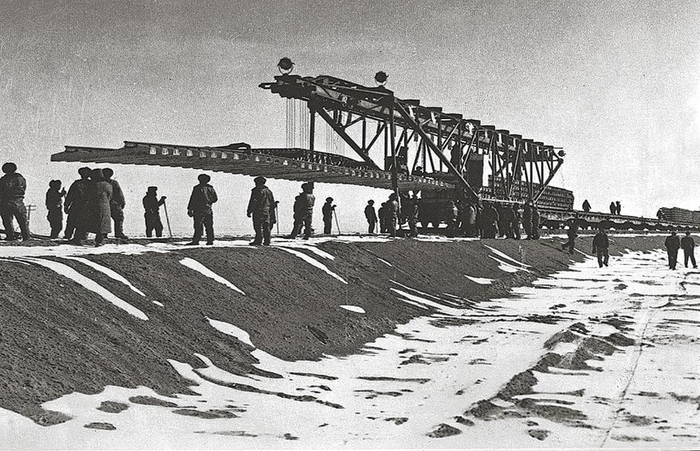 青藏铁路一期工程铺轨的情景。通讯员杨林提供