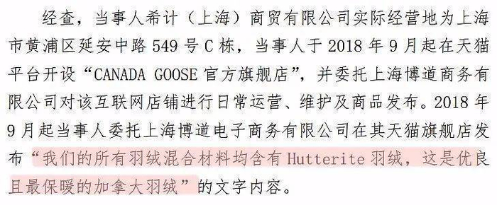 行政处罚决定书显示当事人希计(上海)商贸有限公司主要从事“CANADA GOOSE”品牌羽绒服销售。2018年9月起,当事人在天猫平台开设“CANADA GOOSE官方旗舰店”,委托上海博道商务有限公司进行日常运营、维护及商品发布。同月起,网站发布“我们的所有羽绒混合材料均含有Hutterite羽绒,这是优良且最保暖的加拿大羽绒”的文字内容。