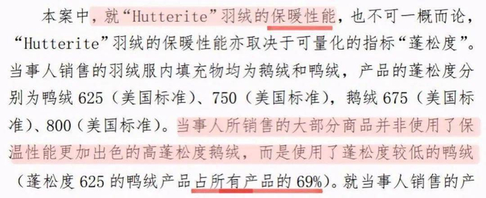 此外,调查还发现,在当事人销售的190款羽绒服装中,鹅绒产品约占16.8%,鸭绒产品约占83.2%。也就是说,其销售的大部分羽绒服并非使用保温性能更出色的高蓬松度鹅绒,而是使用了蓬松度较低的鸭绒,因此,当事人以偏概全地称其产品所使用的羽绒“优良且最保暖”与事实不符。