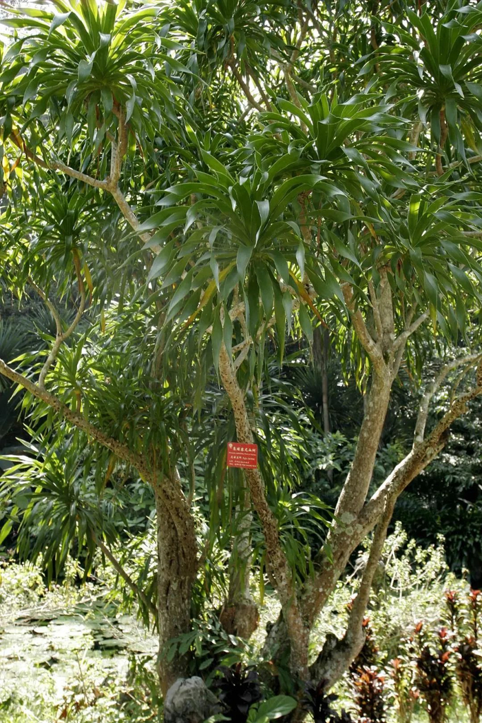 龙血树的主产区在普洱、西双版纳,有着粗壮的树干,生长的枝条呈现伞状。由于其树汁鲜红如血,因此得名“龙血树”。它是名贵的云南红药,与云南白药齐名。它的生长十分缓慢,几百年才能长成一棵树,一百年才开一次花。专家研究,龙血树树龄可达8000多年,是迄今为止知道的植物中最长寿的树。