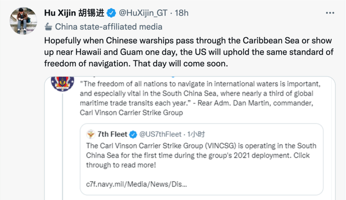 胡锡进随后转引这条推特并反驳称:“希望有一天,当中国军舰穿越加勒比海或出现在夏威夷和关岛附近时,美国会坚持同样的‘航行自由’标准。那一天很快就会到来。”