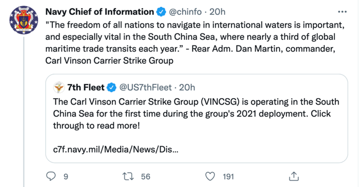 胡锡进这条推文引起了美方的注意,美国海军信息主任转引了该推文,并声称美国海军坚持“航行自由”标准的时间比“中国人民解放军海军存在的时间都长”。