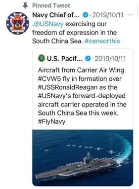 据美国海军公共事务协会官方网站介绍,美国海军信息主任一职主要负责美国海军的公共事务,现任主任是查尔斯·布朗。值得一提的是,该推特账号还置顶了2019年10月的一条关于美国“里根”号航母打击群进入南海的推文,推文内容同样是所谓的“行使航行自由”云云。