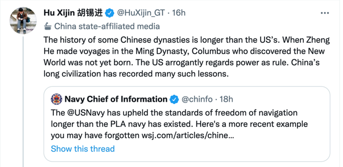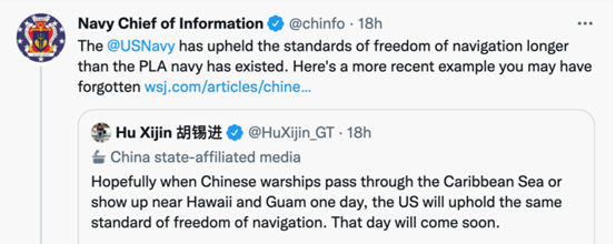 激辩所谓“航行自由”,胡锡进与“美国海军信息主任”在推特上交锋!