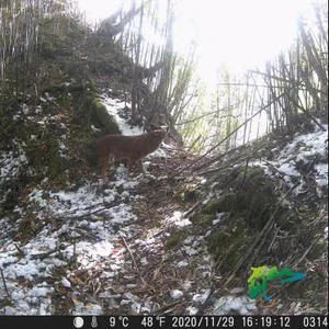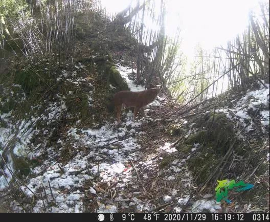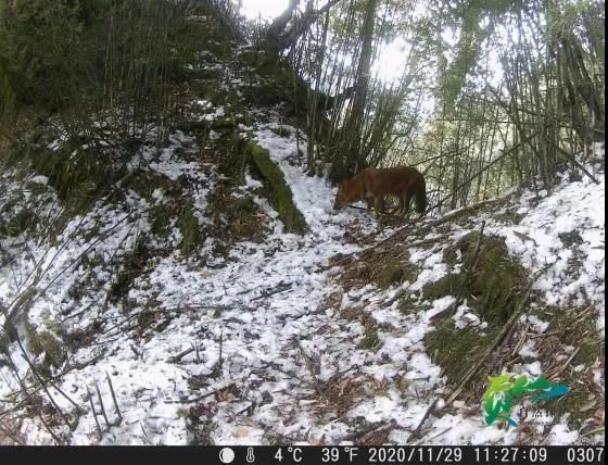 据贡山管护分局一名技术人员介绍,红外相机拍摄到豺的时间为2020年11月29日中午时分。从记录的监控画面中可以看到,一只毛色棕红,犹如家养柴狗的动物现身于一个铺满白雪的山坳中。