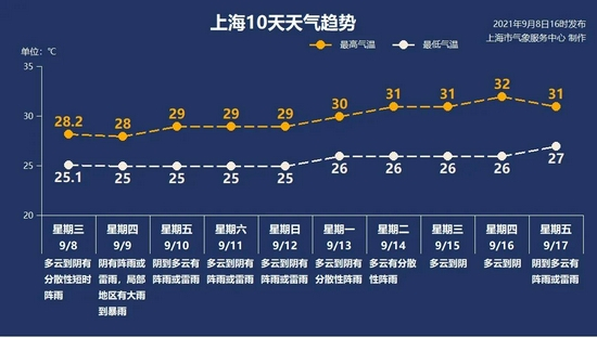 本周末申城多云到阴,多阵雨天气,最高气温在29度左右,下周二起,申城的最高气温又将回升至31、32度附近,届时舒适的体感又将被打破。