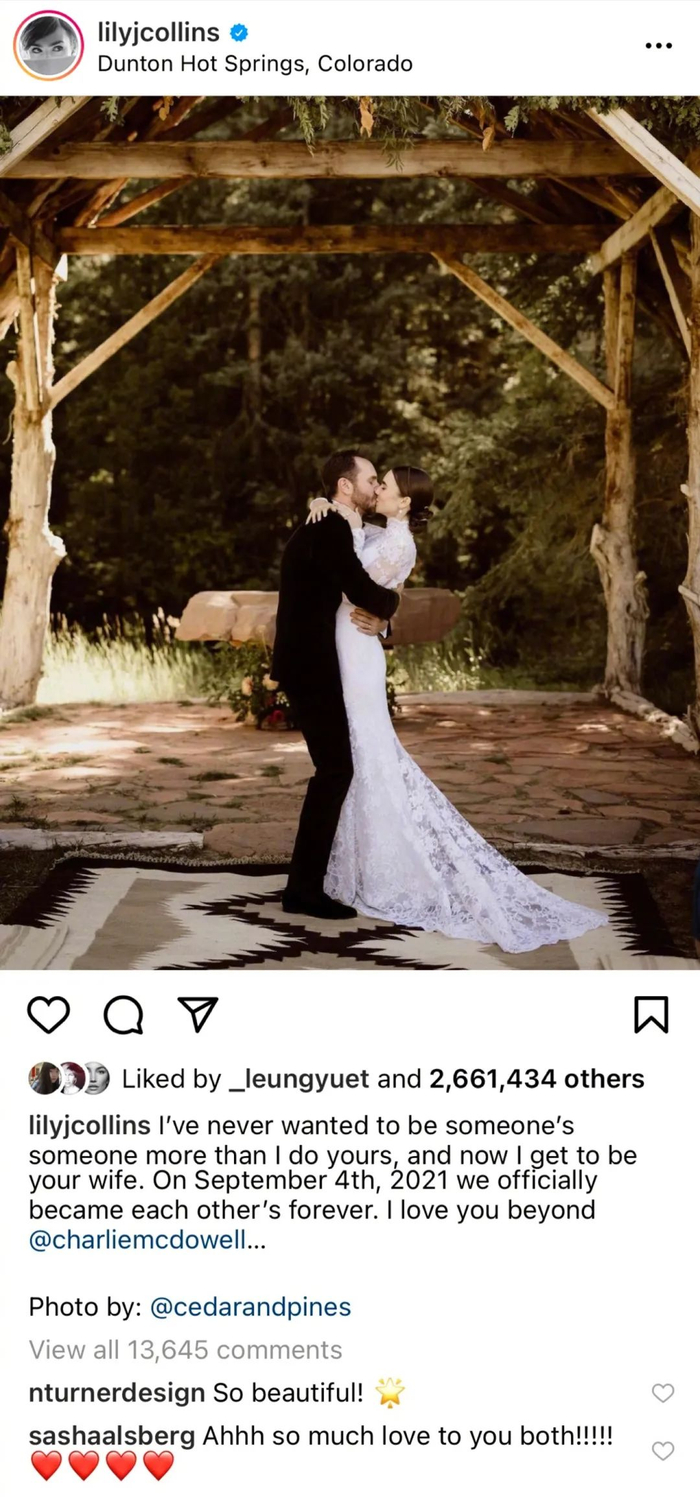 昨天,英国知名演员莉莉·柯林斯(Lily Collins)在社交媒体上宣布了自己完婚的消息: