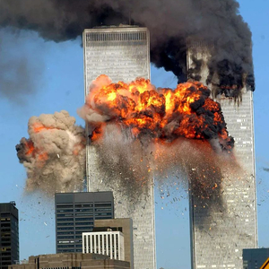 2001年9月11日,美国纽约,被恐怖分子劫持的民航飞机撞击纽约世界贸易中心,浓烟从纽约世贸中心北塔滚滚而出,15分钟后第二架联合航空公司175号航班撞击世贸中心南塔。(图源:视觉中国)