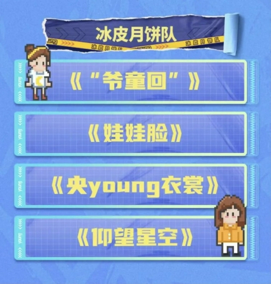 由“冰皮月饼队”带来的节目是《“爷童回”》《娃娃脸》《央young衣裳》《仰望星空》。据战队成员自己透露,集齐女生与男生一同唱跳的《娃娃脸》将会让观众收获眼前一亮的体验,等待大家解锁。