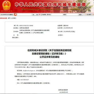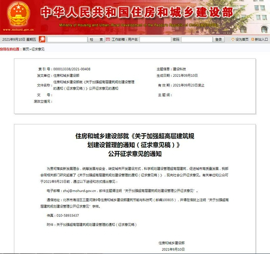 10日,住房和城乡建设部在官网公布《关于加强超高层建筑规划建设管理的通知(征求意见稿)》,向社会公开征求意见。